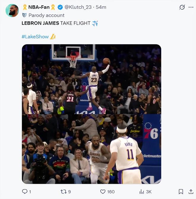 休息了两天的詹姆斯感觉身体状态明显转优,东契奇助攻詹姆斯下快攻突破,他在恩比德的身前又完成了一次单臂劈扣,湖人媒体直接欢呼了,我们熟悉的那个勒布朗回来了。
