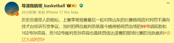 在上赛季常规赛最后一轮辽篮对阵山东队的比赛,当时杨鸣对吹罚不满向记录台投诉而引发争议的裁判员,正是99号胡廷胜和102号孙翌淼。莫非他俩一直都看杨鸣不顺眼?视辽篮是眼中钉肉中刺?这次就是专门来报复的吗?