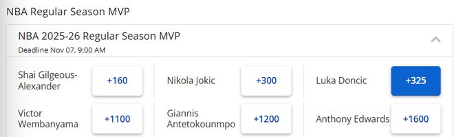 最新MVP赔率显示,东契奇是+325,暂列第三,但已经非常接近第二的约基奇(+300),而亚历山大(+160)目前排在榜首。