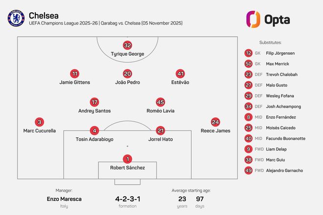切尔西首发:1-罗伯特-桑切斯、3-库库雷利亚、4-阿达拉比奥尤、21-哈托、24-里斯-詹姆斯、17-安德雷-桑托斯、45-拉维亚、11-吉滕斯、20-若昂-佩德罗、41-埃斯特旺、32-乔治