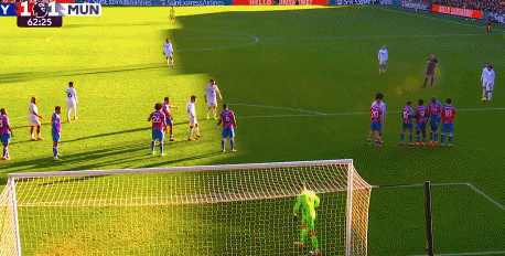 这是曼联的任意球机会,B费做球,芒特禁区外右脚劲射破门,曼联2-1!