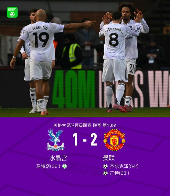 曼联2-1逆转水晶宫,齐尔克泽凌空斩破荒,B费两助攻